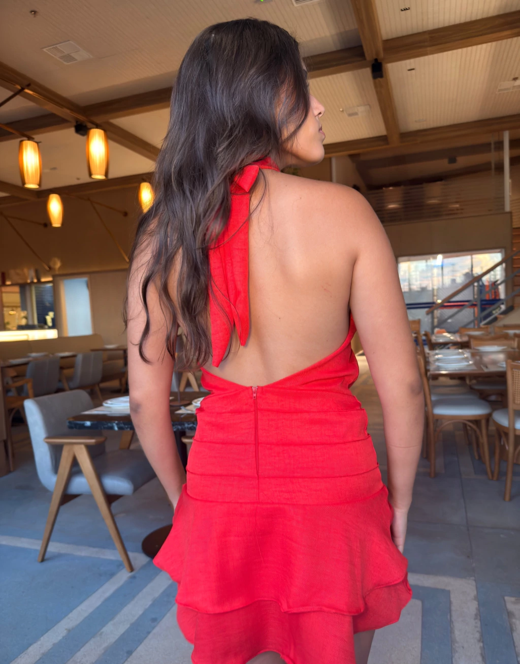 O Vestido Zara é a escolha ideal para quem busca um visual delicado e marcante. Modelo curto, com babados na saia que trazem movimento e feminilidade. Possui recortes que valorizam a cintura, costas abertas e amarração no pescoço, garantindo ajuste perfeito e um toque de sensualidade. O detalhe em pingente dourado finaliza o look com elegância. Perfeito para festas, jantares e celebrações onde você quer brilhar com charme e confiança.